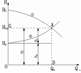 由圖 2所示,設(shè)用戶所許流量 QA 減少為 QB,當(dāng)通過(guò)關(guān)小閘門(mén)來(lái)實(shí)現(xiàn)時(shí),管阻特性將改變?yōu)榍€③,而揚(yáng)程特性則仍為曲線①,故供水系統(tǒng)的工作點(diǎn)由 A 點(diǎn)移至 B 點(diǎn)。 這時(shí):流量減少了,但揚(yáng)程卻從 HTA 增大為 HTB;由式二可知,供水功率 PG 與面積 OEBF 成正比。